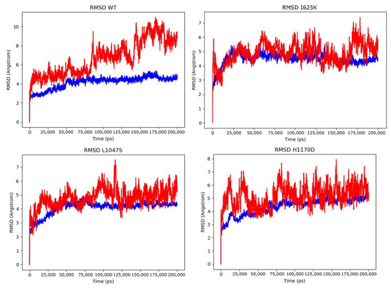 Results of 200 ns MD simulations of DROSHA wild-type protein along with its mutants (I625K, L1047S, H1170D) in a complex with miRNA. The RMSD plot for protein structure is colored blue, and RMSD fluctuations of miRNA are indicated by red.