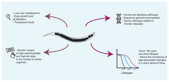 To increase the knowledge about the cellular damage induced by these conditions, high-carbohydrate intake studies in C. elegans have been conducted in high-glucose diets that mimic the high-carbohydrate diets consumed by humans. One of the most intriguing results is the reduction of its lifespan and changes in several metabolic regulators that contribute to it exerting deleterious effects by which glucose decreases lifespan [21].