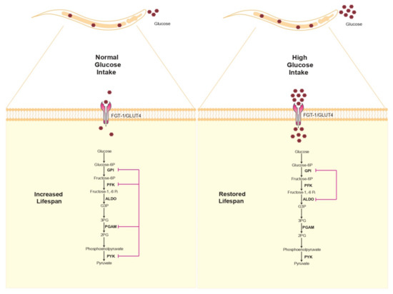 A high-glucose diet is considered a determinant factor for the development of obesity, type 2 diabetes, and cardiovascular diseases in humans [35,36]. To increase the knowledge about the cellular damage that provokes these conditions, studies in C. elegans have been undertaken using similar high-glucose diets. The results showed that the reduction of the lifespan of C. elegans involved many of the enzymes related to glycolysis [37]. To analyze whether enzymes of the glycolytic pathway are involved in the diminished lifespan of nematodes, Lee et al. grew worms on a high-glucose diet and inhibited each step of the glycolytic pathway using RNAi. They found that genetic inhibition of glucose GPI or fructose-1,6-bisphosphate aldolase (ALDO 1,2) is capable of suppressing glucose toxicity and restores the lifespan (Figure 2). Interestingly, the deleterious effects are in part due to the blockade of these enzymes because its absence may reduce glycolytic key intermediaries, such as dihydroxyacetone phosphate [38]. Given the above evidence, we speculate that high glucose levels and high glycolytic activity negatively influence the general lifespan of C. elegans.