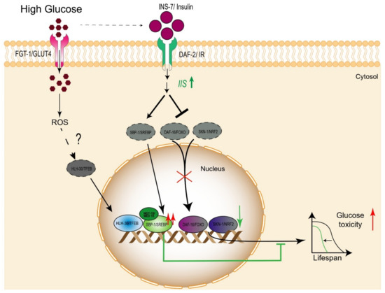 FOXOs (forkhead box O) transcription factors are involved in the regulation of lifespan and longevity via insulin and insulin-like growth factor signaling through the modulation of multiple cellular pathways that regulate several biological processes in mammals [39]. Some studies have associated the possible role of FOXO factors with human longevity; specifically, several alleles from the FOXO1A and FOXO3A genes are enriched in various centenarians populations [40,41,42], while other studies have indicated that FoxO3 is required for the lifespan extension induced by caloric restriction in mice [43]; however, how these factors mediate these effects remains to be fully elucidated. Interestingly, in cardiac microvascular endothelial cells, high glucose stimulates ROS production and inhibits the protein kinase B (PKB/AKT), which subsequently activates FOXO3A and apoptosis [44]. Additionally, it has been documented that FOXO also plays an important role in adverse effects on systemic glucose intolerance and hepatic insulin resistance; therefore, targeting these factors could be an effective strategy for the treatment of diabetes mellitus in patients with hepatic insulin resistance [45,46]. In a similar way, the C. elegans FOXO homolog DAF-16 regulates and integrates diverse pathways responsible for stress resistance and immune response, although it is notorious for its role in the lifespan mediated by the insulin-PI3K-AKT pathway [47,48,49]. C. elegans has several DAF-16 isoforms: DAF-16 a, b, d, and f, which are expressed in different tissues and functions, although DAF-16 a and f appear to have more important roles in lifespan [50]. DAF-16 activation relies on post-translational regulation, whereby its translocation into the nucleus is mediated by its phosphorylation status, driven mainly by the insulin–insulin-like growth factor 1 (IGF-1) signaling (IIS) pathway and nutritional state. Specifically, any conditions that reduce IIS or nutrient scarcity lead to DAF-16 nuclear translocation, whereby it modulates transcription of its target genes, promoting lifespan extension in worms (Table 1). Several studies have documented that a glucose-enriched diet significantly shortens the lifespan of C. elegans. Interestingly, it appears that DAF-16 may play a role in regulating this effect. Nematodes grown on a highly glucose-enriched diet showed decreased activity of DAF-16, which occurred through activation of its principal negative regulator, the IIS [51]. This fact was proven, because under a high-glucose diet, the mutant strain of DAF-16 did not further decrease its already reduced lifespan, and interestingly it can generate a genomic response similar to wild-type nematodes grown under a high-glucose diet; similarly, a long-lived mutant of the insulin receptor (daf-2) with reduced IIS also exhibited a short lifespan when exposed to a high-glucose diet (Table 1) [51]. As such, high glucose intake stimulates insulin signaling, which decreases lifespan in part by inhibiting DAF-16 (Figure 3).