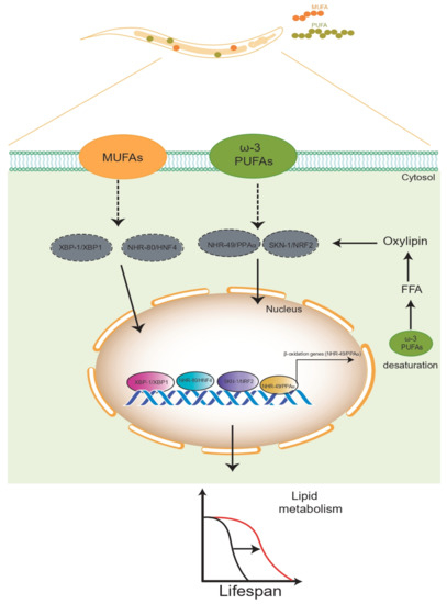 Effects of different dietary lipids on the lifespan of C. elegans. Exogenous MUFAs and PUFAs contribute to lifespan extension via activation of several transcriptional factors that promote gene transcription of enzymes for fatty acid desaturation, which might play an important role in the positive regulation of the lifespan.