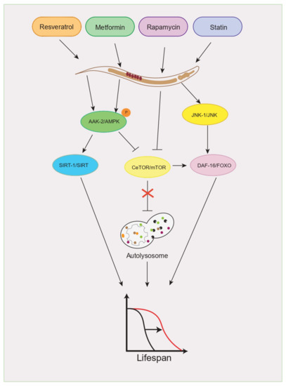 Emerging data suggest that carbohydrate–lipid intake plays a critical role in metabolic dysregulation that impacts longevity. A pharmacological treatment approach can be used in the treatment of metabolic diseases. Several drugs have been shown to improve lifespan when affected by energetic sources. Metformin is a drug commonly prescribed to treat patients with type 2 diabetes and obesity, the benefic effects of which enhance insulin sensitivity, induce glycolysis, and suppress gluconeogenesis in the liver [146]. It has been reported that chronic metformin exposure lengthens the lifespan and attenuates the deleterious effects of aging in male mice. The effects of metformin to some extent resemble the effects of caloric restriction, even if food intake is increased [147]. Interestingly, as in mammals, metformin promotes health and extends the lifespan in C. elegans, whose mechanism of action is attributed to the activation of adenosine-monophosphate-activated protein kinase (AAK-2/AMPK), which inhibits mTORC1 and consequently activates autophagy and the lysosomal pathway (Figure 5) [148,149,150,151]. Statins are among the most prescribed drugs worldwide to treat hypercholesterolemia. They specifically inhibit the enzyme hydroxymethylglutaryl coenzyme A (HMG-CoA) reductase, thereby preventing the conversion of HMG-CoA to mevalonate, which represents an early rate-limiting step in cholesterol biosynthesis [152]. Statin drugs have been studied in a large number of individuals, showing that these drugs reduce the risk of atherosclerotic cardiovascular disease and mortality with few side effects [153]. Analysis of the effects of statins (lovastatin), as well as genetic inhibition of the HMG-CoA reductase in C. elegans, showed that low doses of lovastatin prolong its lifespan via induction of Jun N-terminal kinase (JNK-1), a known activator of DAF-16/FOXO, as well as some DAF-16 target genes related to lifespan extension (Figure 5) [154]. Resveratrol (3,5,4′-trihydroxystilbene) is a polyphenol abundant in red grapes. The treatment with this compound has been shown to prevent the deleterious effects of excess caloric intake through modulation of energy balance. Specifically, resveratrol shifts the physiology of mice consuming excess calories via increased insulin sensitivity, reduced insulin-like growth factor-1 (IGF-I) levels, increased AMPK, and peroxisome-proliferator-activated receptor-γ coactivator 1α (PGC-1α) activity, which consequently increases mitochondrial quantity and improves motor function [155]. The mechanism of action of resveratrol remains elusive; however, AMPK and the NAD-dependent deacetylase SIRT1 have been proposed to mediate the pro-survival response. The pro-longevity effects of resveratrol in C. elegans are conveyed through sirtuin-1-dependent induction of autophagy, suggesting that this process is universally required for the lifespan-prolonging effects of pharmacological sirtuin-1 activators (Figure 5) [156]. Although resveratrol exhibits certain benefits on lifespan, these findings were questioned by a report suggesting that resveratrol supplementation only marginally increases the lifespan of C. elegans and that this small effect is preserved in Sir2-mutant strains [157]; thus, future studies will need to be carefully designed to examine the effects of resveratrol on the organismal lifespan. Rapamycin is an antifungal metabolite that is well known for its inhibitory effects on mTOR in mammals [158]; mTOR signaling is an important player in longevity regulation. In mammals, rapamycin extends the median and maximal lifespans of both male and female mice when feeding begins at 1.6 years of age [159]. Acute or chronic treatment with rapamycin abrogates insulin resistance in mice; however, it has also been reported that chronic treatment with rapamycin can also cause glucose intolerance and even insulin resistance [160,161]. Genetic or pharmacological (rapamycin) inhibition of mTOR signaling has been found to extend the lifespan of C. elegans. When TORC1 is inhibited, either genetically or with rapamycin, C. elegans triggers activation of SKN-1 and DAF-16 to promote several protective genes, increasing stress resistance and longevity (Figure 5) [162].