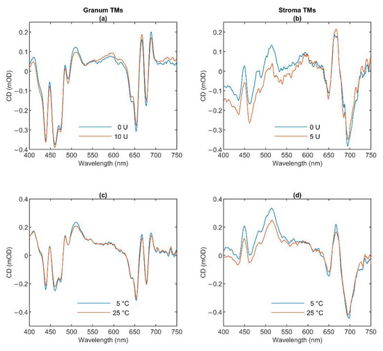 To characterize the molecular organization of the pigment systems we measured the CD spectra of the two types of TMs (Figure 1). Blue curves show the typical spectra of the untreated granum (Panels a and c) and stroma (Panels b and d) TMs at 5 °C. The spectrum of granum TMs is dominated by the excitonic bands of LHCII, displaying band pairs at (−)653 and (+)665 nm in the red, and (+)484 and (−)473 nm in the Soret region [35,36]. The bands at (+)689 and (+)510 nm, the amplitudes of which varied from batch to batch, are attributed to residual psi-type bands reflecting the remaining long-range order of the pigment PPCs in the granum TM preparations. In purified PSII membranes—BBY [37] and grana patches [38], lacking multilamellar organization—these bands are absent [39].