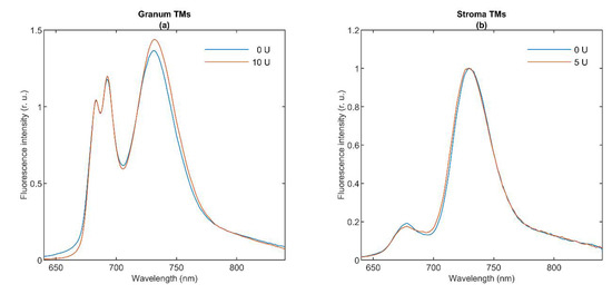 The fluorescence emission signal of Chl a in TMs at 77 K originates from LHCII (680 nm), core antennas of PSII (685 and 695 nm), PSI core (720 nm), and LHCI (735 nm) [9]. Figure 2 shows the 77 K fluorescence emission spectra of granum (Panel a) and stroma (Panel b) TMs (blue curves). Granum TMs exhibit intense peaks at 683 and 693 nm, showing the significant emissions from PSII; and at 730 nm, which can be attributed to PSI emission originating from the end membranes of grana. In contrast, the spectrum of stroma TMs is dominated by the PSI band at 730 nm, with weaker bands below 700 nm, probably arising from either LHCII-PSII or LHCI. Our 77 K emission spectra of stroma TMs are closely reminiscent of spectra published earlier on similar preparations [42,46]. As shown in Figure 2, lipase treatments (red curves) induced virtually no change in the spectra. The effect of high temperature on stroma TMs was examined by [42] reporting only minor changes up to 35 °C; elevated temperatures (above 50 °C) caused gradual disassembly of the PSI supercomplex and the denaturation of the antenna complexes. No sizeable changes were seen between the 5 and 25 °C in the 77 K fluorescence emission spectra of granum TMs (data not shown).