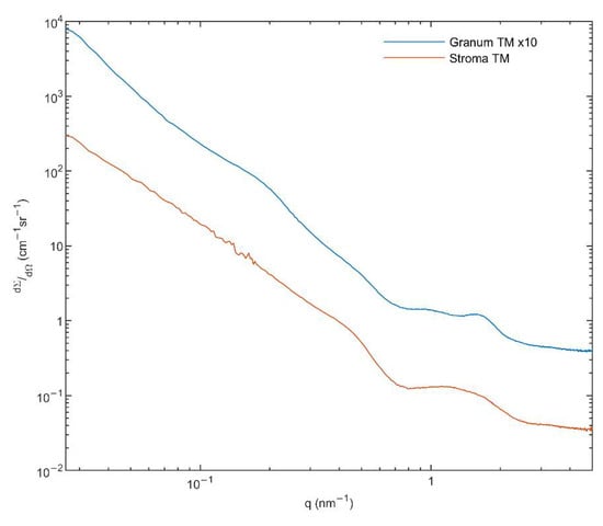 To obtain information on the structure of the membrane particles and the presence of HII phase [55], we performed small angle X-ray scattering (SAXS) experiments on the granum and stroma TMs. As it can be observed in Figure 4, these TM particles displayed significantly different SAXS patterns. The distinct shape of curves, especially in the middle range of the scattering variable from 0.7 to 2 nm−1, indicates different layer arrangements. The SAXS of grana shows two diffuse reflections at q = 0.95 and 1.58 nm−1, corresponding to 6.6 and 4.0 nm, respectively. These values are close to that which were observed in the computed scattering curves of a model grana stack [56]. In our case, the diffraction profiles are smoothed corresponding to a weakly correlated multi-lamellar system, with a repeat distance of ~31 nm. This value agrees reasonably well with that found in intact TMs suspended in sorbitol-based medium—using small-angle neutron scattering [57]. The SAXS curve of stroma TMs exhibits a hump, as an extremely broadened diffraction profile reflecting a drastically loose hierarchy of the stroma lamellae. Additionally, a shoulder appears in the scattering at q ~0.5 nm−1. This local scattering increment might be the consequence of the scattering of individual objects, most probably the ATP synthase, the size of which contributes to scattering in the same interval [58]. It must also be pointed out that our SAXS data revealed no indication of the presence of the HII phase.