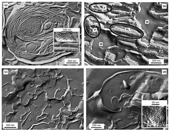Freeze-fracture electron microscopy images of granum (a,b) and stroma (c,d) TMs; images of different regions with different magnifications; insets in (a,d), protein rich regions; P, W, and NL in (b) stand for regions dominated by proteins, water and non-bilayer lipid phase.
