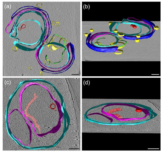 To substantiate our conclusions on the fusion of isolated membrane fragments and the formation of small vesicles, and to attempt detecting membrane-associated lipid assemblies with HII geometry, we performed cryo-electron tomography. Figure 7a,b show the 3D model of multilamellar granum TMs. Evidently, the TMs of two adjacent grana partially are fused, as observable in more detail in the tomographic reconstruction (Videos S1 and S2). The tomographic reconstruction also revealed characteristic strong densities of headpieces of ATP synthase at peripheral membranes and areas with symmetrical densities of rectangular shape characteristic of PSII core complexes (Video S1) (for a comparison see [66,68]). We also identified small lipid vesicles (Figure 7a,b, yellow), which are outside the granum TM with either partial or no contact with the membrane. In addition, two lipid vesicles spanning the membrane vesicle can be identified (Figure 7a,b, red), which might participate in lipid fusion between two adjacent membranes [69].
