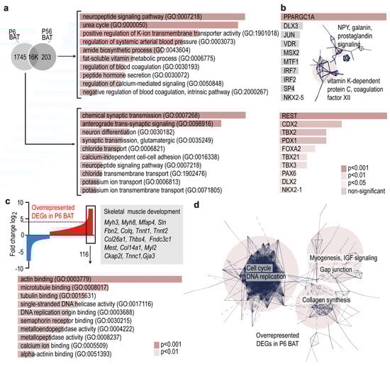 Gene ontology analysis and gene networks of BAT-specific transcripts. (a) Venn diagram showing uniquely expressed genes in P6 BAT or P56 BAT. GO terms associated with P6-, and P56-specific transcripts. (b) Transcription factor-binding prediction for P6-, and P56-specific transcripts. Inset shows gene networks of P56-specific transcripts. Combined p-values of the enrichment are shown in color codes in panels a and b. (c) Top: Gene expression profiles of P6 and P56 BAT were compared, and the differences were visualized on the Y-axis as log2 of fold change of DEGs. DEGs overrepresented at P6 are indicated in red, and underrepresented DEGs are shown in blue. The 116 DEGs which were ≥4.5-fold overrepresented in P6 were analyzed further. Bottom: GO terms of the 116 most overrepresented DEGs. (d) Interactome map of DEGs overrepresented in P6 BAT. PPI enrichment p-value < 1.0 × 10−16.