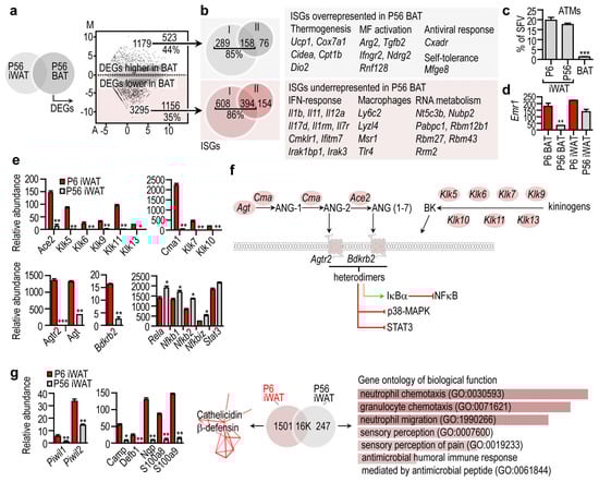 Immune-related gene transcripts in the BAT and in the iWAT. (a) P56 iWAT and P56 BAT were compared, and the DEGs were visualized in a scatter plot. Number of DEGs, and the percentage of interferon-stimulated genes (ISGs) are shown. (b) Representative ISGs overrepresented or underrepresented in BAT. (c) Percentage of adipose tissue macrophages (ATMs) within the stromal vascular fraction (SVF) of P6 iWAT, P56 iWAT and P56 BAT. *** p < 0.001, two-way ANOVA with Dunnett’s post hoc test, using P6 BAT as reference group (d) Expression level of the macrophage marker Emr1, encoding F4/80 antigen. ** p < 0.01, two-way ANOVA with Dunnett’s post hoc test, using P6 BAT as reference group. (e) Expression level of genes associated with the local angiotensin and kininogen system. * p < 0.05, ** p < 0.01, *** p < 0.001, Student’s two-tailed unpaired t-test. (f) Scheme summarizing the cell compartment association of the gene products associated with the local angiotensin and kininogen system. All indicated gene products were overrepresented in P6 iWAT. (g) Left: Expression level of PIWI protein-encoding genes, and genes encoding cathelicidin and β-defensins. * p < 0.05, ** p < 0.001, Student’s two-tailed unpaired t-test. Middle: Cathelicidin and β-defensin gene network overrepresented in P6 iWAT. PPI enrichment p-value < 1.0 × 10−16. Right: Gene ontology of DEGs overrepresented in P56 iWAT. Combined p-value < 0.01.