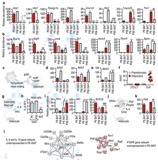 Transcription of beige-marker genes and beige-inducing signal pathways. (a,b) Transcript level of genes previously defined as markers of BAT and beige adipocytes. Ucp1 is key for nonshivering thermogenesis; Ppargc1a is a regulator of mitobiogenesis; Cidea, Cox7a1, Dio2, Tmem26 and Tbx1 are markers of beige adipocytes; Eva1a is a marker of BAT; Myf5 is expressed by progenitors of BAT adipocytes; Lhx8 and Zic1 are markers of BAT. The levels of Hoxc8 and Hoxc9 increase during WAT adipocyte development. Agmo is responsible for the degradation of beige adipocyte-inducing lipid species, so-called alkylglycerols (AKGs). (c) Scheme of beige induction by β-adrenergic stimuli of the sympathetic nervous system. (d) Level of β-adrenergic receptors. (e) Level of Adrb3 in the various fat depots. (f) Adrb3 level in 3T3-L1 preadipocytes and in in vitro cultured primary preadipocytes of the iWAT stromal vascular fraction (SVF). Adipocyte development was chemically induced. (g) Scheme of IL-4-induced adipose tissue browning. (h) Percentage of mast cells in the SVF of iWAT and BAT. (i) Expression level of IL-4 signaling in the various fat depots. (j) Scheme of adipose tissue browning induced in postnatal life by the AKG–PAF–IL-6 axis. (k) Expression of Paftr. (l) Underrepresented gene network of IL-4 signaling in P6 iWAT. Overrepresented gene network of PAF signaling in P6 iWAT. PPI enrichment p-value < 1.0 × 10−16. * p < 0.05, ** p < 0.01, *** p < 0.001, two-way ANOVA with Dunnett´s post hoc test, using P6 BAT as reference group, # p < 0.05, ## p < 0.01, ### p < 0.001, Student’s unpaired, two-tailed t-test.