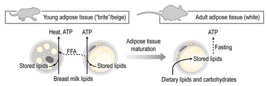 Traditionally, two types of adipose tissue have been distinguished based on their cell morphology and functions: white adipose tissue (WAT) and brown adipose tissue (BAT) [9,10]. Adipocytes of the WAT are adapted for the long-term storage of fat and have the capacity to accumulate neutral lipids in a large droplet, which are broken down in response to hormonal signals under starvation [3]. By contrast, adipocytes of the BAT actively break down fat and oxidize fatty acids into ATP or heat [11,12,13]. BAT adipocytes are rich in mitochondria, and lipids are found in multiple small droplets surrounded by mitochondria [10,14,15,16]. BAT is also rich in glycogen, which, in addition to neutral lipids, serves as a metabolic fuel in cold-challenged BAT adipocytes [10,14,15,16]. Primordial fat cells in WAT and BAT depots contain glycogen and neutral lipids at birth [17,18,19], and these energy reserves comprise 1% and 16% of the body weight, respectively, in a newborn human [18]. Adipocyte lipolysis occurs rapidly after birth, followed by de novo fatty acid synthesis and lipogenesis that is accompanied by the catabolism of glycogen (so-called glycophagy) [20]. Glycophagy promotes lipid droplet formation, and lipid droplets are formed within glycogen clusters in developing BAT adipocytes [17]. The build-up of lipid stores continues during infancy, and is fueled by lipids consumed from breast milk or formula milk [21]. It is plausible that the scattered and small nature of lipid droplets in BAT increases their accessibility for mitochondrial β-oxidation [9,22]. Indeed, the difference in lipid droplet morphology is a distinguishing hallmark of WAT and BAT, and WAT adipocytes are often termed as unilocular (meaning “with one site” of fat storage) while BAT adipocytes are multilocular (meaning “many sites” of fat storage) [9,10,20,23]. WAT is present in all extant vertebrates, whereas BAT develops only in mammals, and is a less prevalent fat depot than WAT [24]. BAT is also typically located in the interscapular region [13], although thermogenic fat is present in the supraclavicular region, around large arteries and in the kidney capsule [25,26,27]. Obesity develops as a result of the expansion of WAT and decreases the amount of BAT [28,29,30]. Pediatric obesity is a current public health challenge, and it is thought that the decline in BAT during growth accelerates the development of obesity in children and adolescents [31].