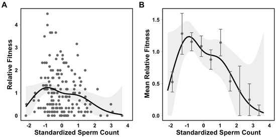 Univariate fitness surface for sperm count, which was characterized by both negative linear selection and negative quadratic selection. In both plots, the solid line represents the predicted relative fitness from the GAM model with the best fit (K = 6; Supplementary Materials Figure S1), and the grey shaded area represents the 95% confidence interval of the model prediction. Panel (A) shows each individual male as a data point, while panel (B) summarizes males into 10 bins of approximately equal size, with mean ± SE for each group to better visualize the fitness surface.