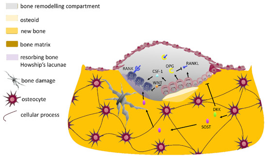 Osteocytes also contribute to ending the remodeling process in response to biomechanical stress and produce sclerostin (SOST) (an antagonist of the anabolic Wnt/catenin signaling in osteoblasts) which inhibits bone formation [29,30] (see Section 3.1.1).