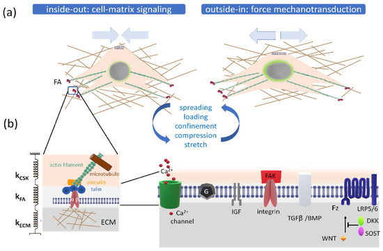 (a) Representation of inside-out and outside-in mechanotransduction signals. Focal adhesions (FAs) serve as crucial sites for transferring forces in both directions. Integrins are coupled to the cytoskeleton via molecules such as vinculin, talin and α-actin. (b) Protein network clusters across the extracellular matrix, transmembrane proteins and cytoskeleton regions of a spread cell. On the right side, three nonlinear spring series conceptualize the mechanical linkage between the cytoskeleton, focal adhesion complex and extracellular matrix, with respective nonlinear spring constants: kCSK, kFA, kECM. On the left side, a zoom of the membrane portion is represented. Mechanical signals perceived by membrane-bound receptors such as stretch-activated Ca2+ channels, integrins, G proteins, IGF and TGFβ and/or BMP receptors are stimulated by mechanical forces and converted into a proper biological response (Table 2). The ECM and intracellular pathways are biochemically coupled by mechanotransduction pathways: mechanical resistance to intrinsic forces regulates the stability of focal adhesion complex that contains focal adhesion kinase (FAK), which phosphorylates and activates mechanoresponsive signaling elements. Line with an arrowhead indicates a positive action, and line with a bar indicates inhibition.