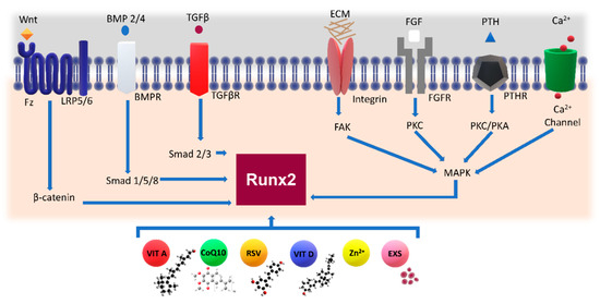 - Shakibaei, M.; Shayan, P.; Busch, F.; Aldinger, C.; Buhrmann, C.; Lueders, C.; Mobasheri, A. Resveratrol Mediated Modulation of Sirt-1/Runx2 Promotes Osteogenic Differentiation of Mesenchymal Stem Cells: Potential Role of Runx2 Deacetylation. PLoS ONE 2012, 7, e35712. [Google Scholar] [CrossRef] [PubMed]
