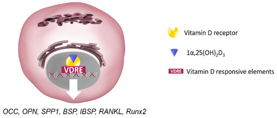The VDR acts by binding with vitamin D response elements (VDRE) to modulate gene transcription [143]. 1α,25(OH)2D3 affects human osteoblast growth and differentiation through both the classic VDR-mediated genomic pathway and membrane receptor-mediated rapid responses [144,145,146,147].