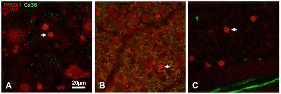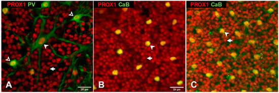 - Lavado, A.; Oliver, G. Prox1 Expression Patterns in the Developing and Adult Murine Brain. Dev. Dyn. 2007, 236, 518–524. [Google Scholar] [CrossRef]