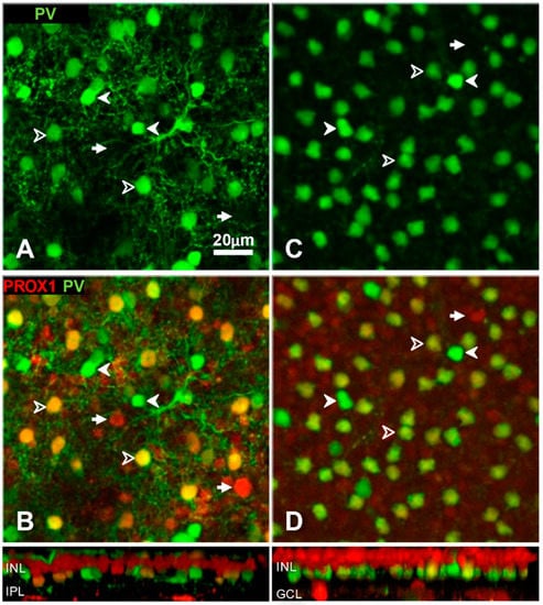 - Dyer, M.A.; Livesey, F.J.; Cepko, C.L.; Oliver, G. Prox1 Function Controls Progenitor Cell Proliferation and Horizontal Cell Genesis in the Mammalian Retina. Nat. Genet. 2003, 34, 53–58. [Google Scholar] [CrossRef]