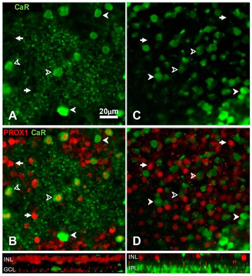 - Goebel, D.J.; Pourcho, R.G. Calretinin in the Cat Retina: Colocalizations with Other Calcium-Binding Proteins, GABA and Glycine. Vis. Neurosci. 1997, 14, 311–322. [Google Scholar] [CrossRef] [PubMed]