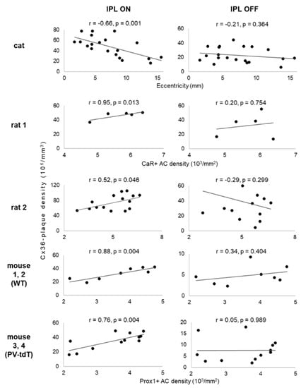 | Correlation of Cx36-density between IPL OFF and IPL ON | r = 0.11 p = 0.325 | r = 0.33 p = 0.587 | r = 0.42 p = 0.121 | r = 0.54 p = 0.463 | r = 0.77 p = 0.075 | ||