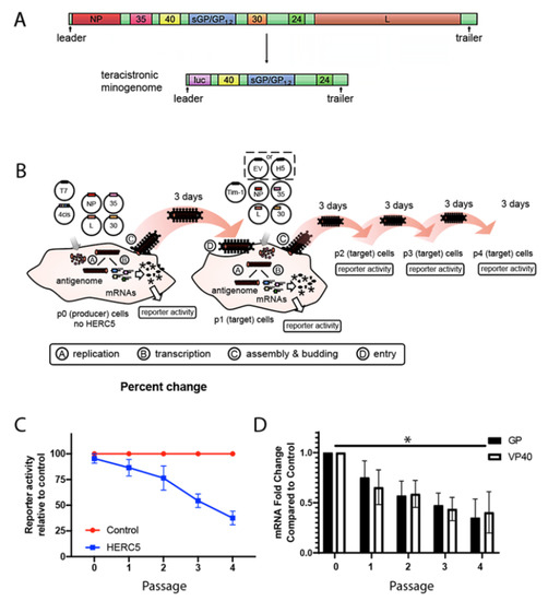 Previous studies have identified HERC5 as a potent inhibitor of diverse viruses [30,31,32,33,34,35,36]. To determine if HERC5 restricts EBOV particle production and replication, we used an EBOV (Zaire) transcription- and replication-competent VLP (trVLP) system. This system utilizes a tetracistronic minigenome (‘4cis’) carrying a luciferase reporter gene together with VP40, VP24, and GP (Figure 1A) [40,45]. The advantage of this system over conventional VLP assays is that the viral proteins VP40, GP and VP24 are encoded by the minigenome and expressed from the EBOV promoter in a more natively regulated fashion [40]. The co-expression of this minigenome with NP, VP35, VP30, and L drive genome replication and transcription, synthesis of the minigenome-encoded proteins, and formation of infectious trVLPs. These trVLPs incorporate minigenomes and are capable of undergoing multiple rounds of replication and infection in target cells that express NP, VP35, VP30, L and Tim-1 (Figure 1B). The replication of these trVLPs was quantified over multiple passages (every three days) by measuring the luciferase reporter activity within cells. As a negative control, the plasmid carrying the Ebola L gene was omitted from the transfections, which abrogated the trVLP formation. Compared to the control cells transfected with an empty vector plasmid, cells expressing HERC5 exhibited a significant reduction in trVLP replication over four passages (Figure 1C). The reduction in luciferase reporter activity also correlated with a reduction in GP and VP40 mRNA levels (Figure 1D).