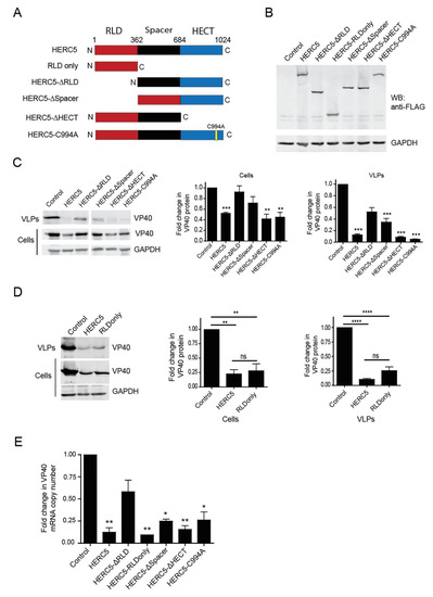 3.3. HERC5 RLD Is Necessary and Sufficient for Inhibition of VP40 Particle Production