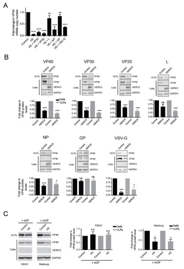 It is interesting that EBOV L protein was also able to rescue HERC5-induced VP40 mRNA depletion but unable to antagonize the release of VP40 VLPs into the cell supernatant. The mechanism underlying this antagonism is not fully understood; however, it was previously shown that L protein antagonizes ZAP [52]. It is possible that L protein also specifically antagonizes HERC5-induced depletion of mRNAs. However, we speculate that the E3 ligase activity of HERC5 remains functional, leading to the ISGylation of viral and/or host proteins and subsequent arrest of later steps in viral particle production.