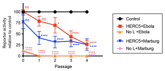 Expression plasmids carrying tim-1, T7, NP, VP35, VP30, L, and the tetracistronic minigenome (p4cis-vRNA-hrLuc) carrying luciferase, VP40, GP and VP24 have been previously described [40,44]. trVLP assays were performed as previously described, with the following changes [40,41]. Passage zero (p0) cells were seeded in 12-well plates and transfected at 50% confluency using Transit LT-1 (Mirus Bio LLC, Madison, WI, USA) with expression plasmids carrying T7-polymerase (125 ng; all amounts per well), the viral proteins NP (62.5 ng), VP35 (62.5 ng), VP30 (37.5 ng), L (500 ng), a tetracistronic minigenome (125 ng), and Firefly luciferase (100 ng) following the manufacturer’s instructions. Twenty-four hours prior to infection of p1, p2, p3 and p4 cells, target cells were pre-transfected with expression plasmids carrying NP (62.5 ng), VP35 (62.5 ng), VP30 (37.5 ng), L (500 ng), Tim-1 (125 ng) and either HERC5 (125 ng) or empty vector (125 ng).