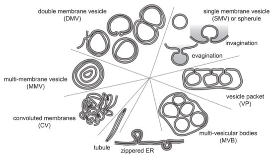 These endomembrane re-arrangements can differ morphologically, from simple dilated membranous structures to very complex structures such as multi-vesicular bodies (Figure 1).