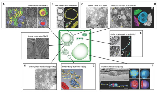 Structure and origin of plant positive-strand RNA virus replication organelles. (A) 3D architecture of TuMV-induced complex membrane structures. Overview of a single slice of a tomogram of a TuMV-infected vascular parenchymal cell. (upper right) The 3D model shows a SMV with fibrillar material inside and with an adjacent intermediate tubular structure. (lower right) 3D model of a DMV with a core of electron-dense materials. Yellow, SMVs; light red, electron-dense materials; green, intermediate tubular structures; light blue, outer membranes of DMVs; dark blue, inner membranes of DMVs; dark red, the electron-dense materials inside DMVs [4]. (B) Dilated ER of BBSV-infected cells with SMVs (left) and 3D surface reconstruction of the tomogram corresponding to the intact spherules (right) depicting the outer ER membrane (yellow), BBSV-induced spherules (gray), and fibrillar materials inside the spherules (green). Scale bars 100 nm [3]. (C) Electron microscopy of MVB structures in PCV-infected BY-2 protoplasts. White arrows indicate clusters of vesicles. Single arrowheads correspond to MVB; MVB containing disordered membranous vesicles are indicated by black arrowheads, whereas those containing one row of vesicles that are surrounded by a single membrane are indicated by white arrowheads. White asterisks correspond to electron-dense material without detectable vesicles [5]. (D) TEM analysis and 3D reconstruction of MNSV-induced altered mitochondria. (left) TEM image of altered mitochondria. Numerous vesicles were observed on the external surface as well as internal large invaginations and internal dilations (star), or both. Yellow arrowheads indicate the pores connecting the lumen of the dilation to the surrounding cytoplasm. (right) 3D model of MNSV-induced altered mitochondria (blue, yellow, red, and purple) with large dilations inside and close interactions with lipid droplets (grey) and chloroplasts (green) [11]. (E) BSMV-induced chloroplast membrane rearrangement and 3D model of altered chloroplast membranes. (left) Tomogram slices of altered chloroplast membranes from leaves of BSMV-infected N. benthamiana. The arrowheads indicate the same spherules in different slices. (right) 3D model of remodeled chloroplast membranes induced by BSMV indicating the outer chloroplast membrane (cyan), inner chloroplast membrane (gray), and spherules derived from the outer membrane (yellow) [13]. (F) 3D visualization of remodeled tonoplasts in CMV-infected cells. (upper left) Tomogram slice of a CMV-infected N. benthamiana leaf cell. CMV-induced spherules are observed on a vacuolar membrane and in a MVB (arrowheads). The cell wall (CW), cytosol (Cy), and vacuole (Va) are indicated. Scale bar 500 nm. (lower left) 3D model depicting the vacuolar membrane (dark blue), MVBs (light blue), spherules on the vacuolar membrane and in the MVBs (yellow), and a membrane compartment (purple) with virus particles (red). (upper left) 3D model of the MVB with spherules open to the cytosol. (lower left) 3D model of the membrane compartment with virus particles. Scale bars 200 nm [14]. (G) 3D reconstruction of TBSV ROs in wild-type yeast cells characterized by peroxisome-peripheral MVBs depicting the MVB membranes (yellow), vesicle-like spherules (blue) located close to a mitochondrion (red) [9]. (H) Electron micrographs of the mesophyll cells of WYMV-infected wheat. The presence of membranous inclusion body structures in the cytoplasm. The ER, membranous inclusion (MI), mitochondria (Mt), pinwheel inclusion (PW), and virus particles (VP) are labelled [6]. (I) A series of 2–7 appressed layers of double-membrane ER in yeast cells expressing both 2a pol and 1a of BMV, double-membrane ER layers are separated by regular, 50–60-nm spaces, the nucleus (Nuc) and cytoplasm (Cyto) are indicated. Scale bars 100 nm [7] Copyright (2004) National Academy of Sciences, U.S.A. The different parts were reproduced with permission.