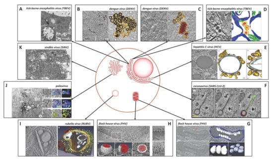The lysosome is another cellular organelle which is a favorite target for some positive-strand RNA viruses such as rubella virus (RUBV) and members of Togaviridae, including Semliki Forest virus (SFV) and sindbis virus (SINV) [53,54,55]. These viruses alter lysosome and endosome structures to form cytopathic vacuoles (CPVs) that represent the viral ROs [54]. In RUBV-infected cells, the rough ER, mitochondria, and the Golgi are clustered around CPVs, which are linked to the cytosol and enclose vesicular structures [31] (Figure 3I). These organelles contain active ROs from which replicated RNA is transported to virion assembly sites at Golgi membranes. These CPVs have a quite variable diameter of 600–2000 nm. Electron tomography and 3D reconstruction revealed that CPVs enclose a variety of different membrane structures such as stacked membranes, rigid membrane sheets, small vesicles, and larger vacuoles that are connected through membrane contacts with each other and functionally connected to the endocytic pathway. CPVs have additional membrane contact sites to other cellular organelles such as the rough ER and Golgi vesicles, but not to nearby mitochondria. Immunogold labeling confirmed the presence of replicase complex proteins and dsRNA inside CPVs, suggesting that RNA synthesis occurs on or in vesicles within the CPVs [31].