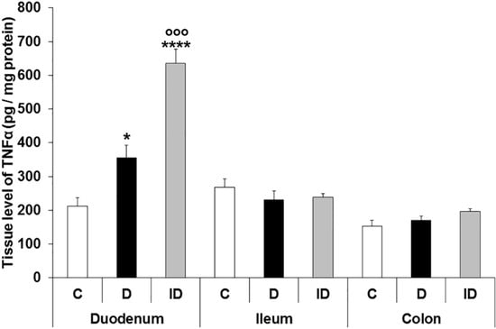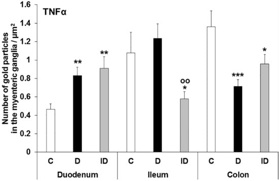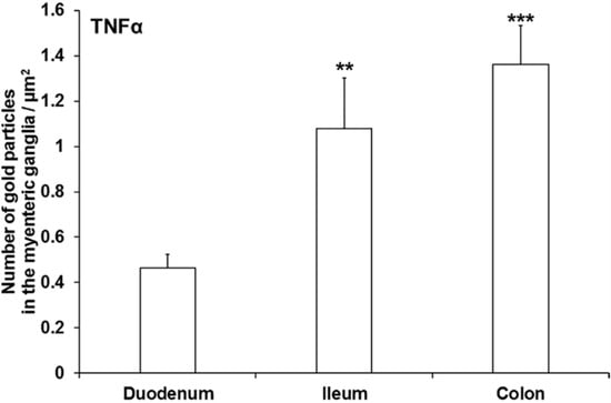 3.2. Presence of TNFα Immunoreactivity in the Intestinal Sections