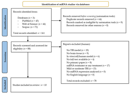 The miRNA search yielded 161 results across the three databases. Of these, 64 duplicate studies were identified and excluded using the reference management software, EndNote (EndNote v.20, PA, USA) [30], along with nine papers which were excluded once filters for free full text/open access were applied within the databases themselves. The remaining 88 records were then manually screened and assessed for eligibility against the selection criteria previously described (Section 2.2). Seventy-eight results were excluded during this process, leaving 10 miRNA studies for inclusion in the systematic review [31,32,33,34,35,36,37,38,39,40]. Figure 1 provides an overview of the miRNA literature search and study selection process.