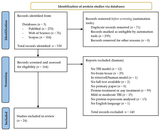 A total of 530 records were identified across the three databases from the protein search. The same search filters were applied, leading to 295 results being excluded while a further 71 duplicates were removed using EndNote 20 [30]. A total of 140 papers were manually excluded following assessment against the selection criteria, leaving a total of 24 papers eligible for inclusion in the review [36,41,42,43,44,45,46,47,48,49,50,51,52,53,54,55,56,57,58,59,60,61,62,63]. Figure 2 provides an overview of the protein literature search and study selection process.