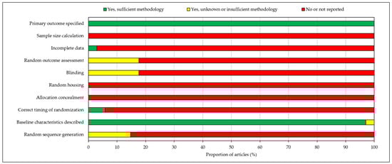 RoB analysis found that all included articles specified the primary outcomes and described baseline characteristics. Nearly all studies (97%) had full data availability with no missing data. However, no studies calculated sample size, randomly housed animals or concealed treatment allocations. Incidences of random sequence generation, correct timing of randomisation, blinding and random outcome assessment were also low, with 85–100% of studies reporting no information concerning these domains. As a result, overall risk of bias was judged to be high and hence may invalidate certain findings of the included papers. RoB analysis results are depicted in a stacked bar chart in Figure 3.