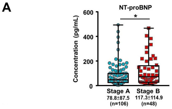 In our study population, we found that Stage B subjects had a higher level of NT-proBNP. It is well known that cardiac hormones and their prohormones are involved in cardiovascular hemostasis via the regulation of natriuresis, diuresis, vasodilatation, and the inhibition of the renin–angiotensin–aldosterone system (RAAS). BNP is a natriuretic hormone that was initially identified in the brain but is released mainly from the heart, particularly as a response when a ventricle is subject to high ventricular filling pressure [51]. Cleavage of the prohormone pro-BNP produces two forms; these are the biologically active 32 amino acid BNP and the biologically inactive 76 amino acid NT-proBNP. These natriuretic peptides play an important role in the diagnosis of patients who are suspected to have HF [52]. It has been shown previously that when an individual is at risk of HF, BNP-based screening and collaborative care is able to reduce the combined rates of LV systolic-diastolic dysfunction and clinical HF [53]. In addition, NT-proBNP-guided RAAS antagonists and beta-blocker therapy in diabetic subjects have been shown to be beneficial and to help prevent cardiac events [54].