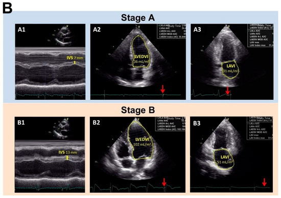 Representative echocardiographic images and the NT-proBNP levels of subjects in Stage A and B heart failure (HF). (A) The NT-proBNP levels of the subjects in Stage A and B HF. * indicated p < 0.05 by independent t-test. (B) Upper panel: a 68-year-old male subject with Stage A HF (body surface area (BSA) of 1.8 m2). His echocardiographic parameters, including interventricular septum thickness (IVS; A1, 7 mm, normal range 6–10 mm), left ventricle end diastolic volume index (LVEDVI; A2, 36 mL/m2; normal range < 95 mL/m2), and left atrium volume index (LAVI; A3, 31 ml/m2; normal range < 34 mL/m2) were within normal ranges. Bottom panel: a 70-year-old male subject with asymptomatic Stage B HF (BSA 1.9 m2). The echocardiographic examination results demonstrated myocardial remodeling, including thickened IVS (B1, 13 mm) and enlarged LVEDI (B2, 102 mL/m2) and LAVI (B3, 51 mL/m2). The red arrow indicates that the echocardiographic pictures were taken at the end-diastolic phase in A2 and B2, and at the end-systolic phase in A3 and B3.
