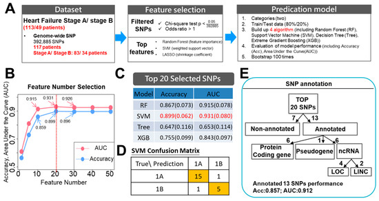 Prediction models built based on the clinical features and genome-wide SNPs were used to classify Stage A and Stage B using machine-learning methods. (A) Machine-learning workflow to select reliable and predictable features to build prediction models for the group classification. (B) The accuracy and AUC of the SVM model with different feature selection numbers. (C) Classification performance of the four machine-learning algorithms with selected feature subsets from genome-wide SNPs. (D) The SVM confusion matrix used for prediction accuracy. (E) Classification of selected SNPs.