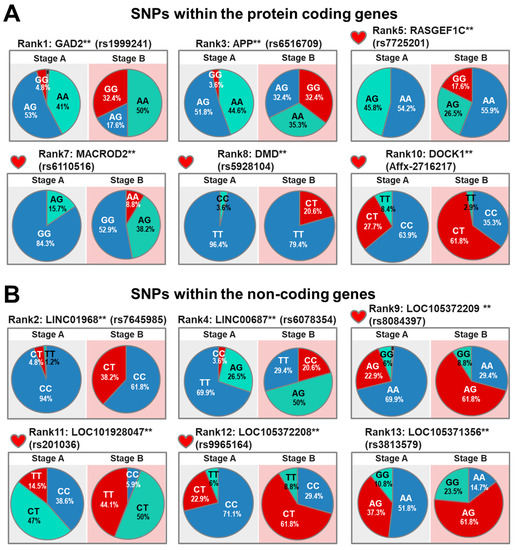 Pie charts indicating the genotype frequencies of the SNPs identified by AI-assisted analysis using the SNP datasets obtained from Stage A and B subjects. (A) Pie charts representing the AI-assisted SNPs within the protein-coding genes, excluding the pseudogene (PGAM1P5). Abbreviations include GAD2: glutamate decarboxylase 2; APP: amyloid beta precursor protein; RASGEF1C: RasGEF domain family member 1C; MACROD2: mono-ADP ribosylhydrolase 2; DMD: dystrophin; and DOCK1: dedicator of cytokinesis 1. (B) Pie charts representing the AI-assisted SNPs within the non-coding genes. rs8084397 is the SNP of LOC105372209 and LOC105372210, and rs201036 is the SNP of LOC101928047 and LOC101928004. # indicates that the signaling by the SNP array was lower than the calling rate. ** p < 0.005 by Chi-square test.
