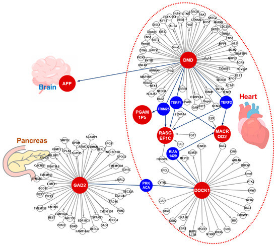 To explore the potential role in the pathogenesis of the high-risk Stage B subjects of the identified protein-coding genes where the SNPs are located, we conducted a protein–protein interaction network analysis in order to identify any potential pathways that might affect cardiac function. Interestingly, five hub proteins, namely TERF1, TERF2, TRIM25, KIAA1429, and PRKACA, were identified in the protein–protein interaction network (marked in blue). This indicates that these proteins are likely to serve as hubs to connect DMD, RASGEF1C, MACROD2, DOCK1, and PGAM1P5 in the heart (Figure 4). In addition, within the protein interaction network, DMD seems to connect with APP, which is expressed in the brain, whereas DOCK1 seems to connect with GAD2, which is expressed in the pancreas (Figure 4). Currently, we cannot rule out the possibility that these two interactions might occur in vivo in cardiomyocytes via a novel mechanism that involves the transportation of the proteins or peptides outside the heart. For example, Aβ, the product of APP, might be released from the brain and delivered to the heart via the circulation where it can interact with DMD, thereby affecting cardiac function.