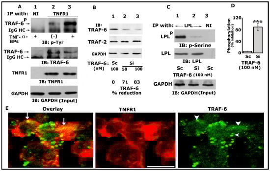 Analysis of the phosphorylation of TRAF-6 by immunoblotting and interaction of TRAF-6 with TNFR1. An equal amount of lysate proteins was used for the immunoblotting (IB) analyses shown in panels (A–C). IB analyses were performed sequentially with the indicated antibody after stripping the blot shown in each panel (A–C). An equal amount of total protein used for immunoprecipitation was assessed by direct IB of the lysates (Input) with a GAPDH antibody (A,C, bottom panels). (A) IB analysis of the interaction of TRAF-6 with TNFR1. Osteoclasts untreated (indicated by a minus sign) or treated (indicated by plus signs) with TNF-α and bone particles for 3–4 h were immunoprecipitated with an antibody to TNFR1 (lanes 2 and 3) or nonimmune serum (NI; lane 1). IB analyses were performed sequentially with indicated antibodies. Phosphorylated TRAF-6 is indicated as TRAF-6P (B). The effects of siRNA of TRAF-6 on the cellular levels of TRAF-6 and TRAF2. An equal amount of total lysate made from osteoclasts treated with a siRNA (Si) or scrambled or RNAi (Sc) was used for the indicated IB analyses in (B). GAPDH was used as a loading control (bottom). The percent reduction of TRAF-6 protein for the representative blot is provided below the panel. The experiment was repeated thrice and obtained a comparable reduction. (C) The effects of siRNA of TRAF-6 on the phosphorylation of LPL. An equal amount of lysate proteins was immunoprecipitated with an antibody to LPL (lanes 1 and 2) or nonimmune serum (lane 3). IB analyses were performed with the indicated antibodies in the figure. Phosphorylated LPL is indicated as LPLP (D). Percent inhibition of LPL phosphorylation is provided in the graph. *** p < 0.001 versus control RNAi (C) treated osteoclasts. Values were expressed as mean ± SEM (n = 3). Uncropped images of autoradiograms (A–C) are provided in the Supplementary Materials. (E) Confocal analysis of the localization of TRAF-6 and TNFR1 in osteoclasts plated on dentine slices in the presence of TNF-α for 2–3 h. The yellow color (indicated by arrows) in the overlay panel represents the colocalization of TRAF-6 with TNFR1. Arrowheads in the green panel point to TRAF-6 localization, where colocalization is shown in the overlay panel. Scale bar: 100 µm.