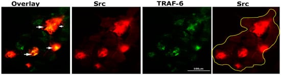 TRAF-6 and Src knockout mice develop osteopetrosis due to impaired bone resorption by osteoclasts [35,36]. In addition, cytoskeletal organization by IL-1 is mediated by the TRAF-6/Src complex [37]. Therefore, we sought to determine by immunostaining analysis whether Src (red) and TRAF-6 (green) were colocalized in osteoclasts plated on dentine and treated with TNF-α for 3–4 h (Figure 3). Intense staining of Src was observed in dense patches, and in some of those dense areas, colocalization (yellow color) of TRAF-6 and Src was found (overlay panel; indicated by arrows). Immunostaining analysis demonstrated possible interaction between these two proteins.