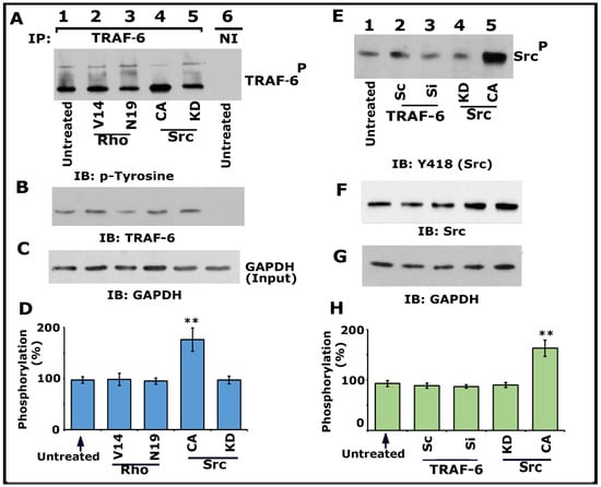 Immunoblotting IIB) analysis of phosphorylation of TRAF-6 and Src kinase on Y418. Osteoclasts untreated and treated with indicated treatments were incubated with TNF-α and bone particles for 3–4 h. (A–D) Lysates made from osteoclasts untreated (lanes 1 and 6) and either transduced with TAT-Rho proteins (V14 and N19; lanes 2 and 3) or transfected with Src Ad-Src constructs (CA and KD; lanes 4 and 5) were immunoprecipitated with a TRAF-6 antibody or nonimmune serum (NI; lane 6). IB was performed with a p-tyrosine antibody (A). The blot was stripped and immunoblotted with an antibody to TRAF-6 to determine the immunoprecipitated levels of TRAF-6 (B). Lastly, direct immunoblotting of the lysates with a GAPDH antibody in panel C demonstrates the equal amount of total protein (Input) was used for immunoprecipitation with TRAF-6 (C). Percent phosphorylation of TRAF-6 is provided as a graph (D). ** p < 0.01 versus untreated osteoclasts. Values are the mean ± SEM of three different immunoblots. (E–H) Lysates made from these osteoclasts treated as indicated in panel E were immunoblotted with an antibody to Tyrosine 418 (Src) (E). The blot was stripped in sequence and immunoblotted respectively with an Src and then with a GAPDH antibody as loading controls for the result shown in panel E. The resulting pTRAF-6/TRAF-6 ratio was used for the quantitative analyses. ** p < 0.01 versus untreated osteoclasts. Results represent one of the three experiments with similar findings. Uncropped images are provided in the Supplementary Materials.