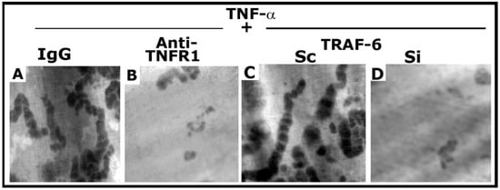 TRAFs have been implicated in the signaling processes mediated by TNF receptor family members, including TNFR1, TNFR2, CD30, and CD40 [53]. In addition, TRAF-6 has been implicated in the cytoskeletal organization and resorptive function of osteoclasts in vitro [54]. We have previously shown that TNF-α/TNFR1 signaling regulates the phosphorylation of LPL and actin-bundling processes involved in bone resorption [25,29]. Thus, we first sought to determine whether TRAF-6 could be one of the downstream regulators of TNF-α/TNFR1 signaling. Osteoclast lysates made from TNF-α untreated (indicated with a minus sign) or treated (+) cells were immunoprecipitated with an antibody to TNFR1 (Figure 1A, lanes 2 and 3) or nonimmune serum (NI; lane 1). Our initial analyses indicated that TRAF-6 (~MW 58–60 kDa) was not only coprecipitated with TNFR1 but also phosphorylated more in response to TNF-α (lane 3). Immunoblotting analysis with TRAF-6 and TNFR1 antibodies demonstrated the immunoprecipitated protein levels of TRAF-6 and TNFR1 (Figure 1A, middle panels).