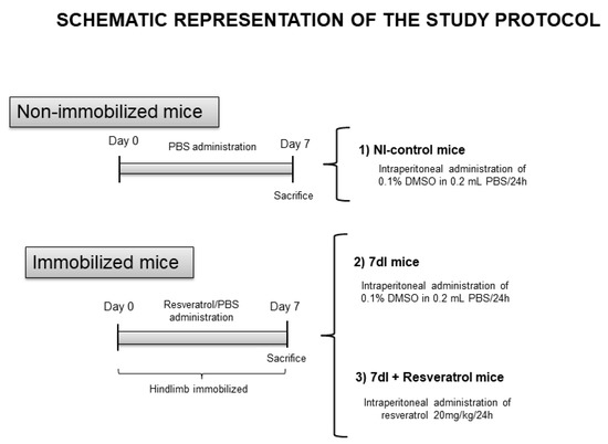 The following groups of animals were studied (n = 10/group, Figure 1): (1) Non-immobilized control mice (NI-control, vehicle 0.1% DMSO and normal saline solution, 0.2 mL intraperitoneal administration) from day 0 to day 7, (2) 7-days immobilized mice (7dI, left hindlimb immobilized for seven consecutive days, vehicle 0.1% DMSO and normal saline solution, 0.2 mL intraperitoneal administration) from day 0 to day 7, and (3) 7dI mice treated with resveratrol (7dI + Resveratrol, intraperitoneal administration, 20 mg/kg weight/24 h, suspended in 0.1% DMSO and 0.2 mL normal saline solution) [28,35,36,37] from day 0 to day 7. The rationale to administer resveratrol intraperitoneally was to ensure that each animal received exactly the same dose of the drug daily. Administration of resveratrol using other routes (water administration, during food, or oral) would not allow us to ensure an identical dose for each mouse. Furthermore, intraperitoneal administration avoids the absorption through the gastrointestinal tract and the first barrier of the hepatic metabolism, as generally happens in oral administration [38,39]. Accordingly, to ensure the optimal absorption of the resveratrol considering its short bioavailability in plasma, 30–60 min estimated in mice [40], intraperitoneal injection was the selected route due to the fact that it enters into the circulation faster than other routes (oral gavage). The three groups of mice (including the non-treated controls) were injected intraperitoneally, in order to control for a potential injection-induced stress response.