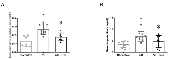 Skeletal muscle troponin-I levels were quantified in plasma of all study groups of mice: NI-control, 7dI, 7dI + Resveratrol, using a specific sandwich ELISA kit (Life Diagnostics Inc., West Chester, PA, USA), as previously described [17,52,53,54,55]. Intra-assay coefficients of variation for the plasma skeletal muscle troponin-I levels ranged from 2% to 10%. Because all the samples were analyzed on the same day, no inter-assay coefficients of variation could be calculated.