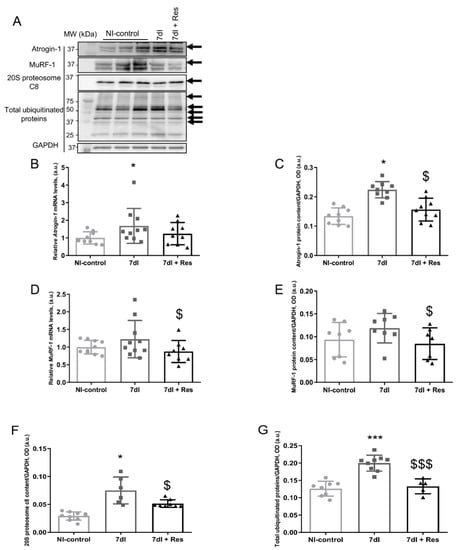 (A) Representative immunoblots of atrogin-1, MuRF-1, 20 S proteasome alpha subunit C8, total ubiquitinated proteins, and GAPDH proteins in the gastrocnemius muscle of all study groups of mice. The analyzed bands are indicated with specific arrows. (B) Mean values and standard deviations of gene expression of Atrogin-1 in the gastrocnemius muscle of the different study groups of mice. (C) Mean values and standard deviations of atrogin-1 protein content in the gastrocnemius muscle of the different study groups of mice, as measured by optical densities in arbitrary units (OD, a.u.). (D) Mean values and standard deviations of gene expression of MuRF-1 in the gastrocnemius muscle of the different study groups of mice. (E) Mean values and standard deviations of MuRF-1 protein content in the gastrocnemius muscle of the different study groups of mice, as measured by optical densities in arbitrary units (OD, a.u.). (F) Mean values and standard deviations of C8-20S protein content in the gastrocnemius muscle of the different study groups of mice, as measured by optical densities in arbitrary units (OD, a.u.). (G) Mean values and standard deviations of total ubiquitinated proteins content in the gastrocnemius muscle of the different study groups of mice, as measured by optical densities in arbitrary units (OD, a.u.). Statistical significance is represented as follows: * p < 0.05 between 7dI animals and the non-immobilized mice, $ p < 0.05 the group of resveratrol-treated mice compared with the 7dI group, *** p < 0.001 between 7dI animals and the non-immobilized mice, $$$ p < 0.001 the group of resveratrol-treated mice compared with the 7dI group. Definition of abbreviations: MuRF-1, muscle RING-finger protein-1; GAPDH, glyceraldehyde-3-phosphate dehydrogenase; MW, molecular weight; kDa, kilodalton; NI, non-immobilized; I, immobilization; mRNA, messenger ribonucleic acid; a.u., arbitrary units; OD, optical densities.