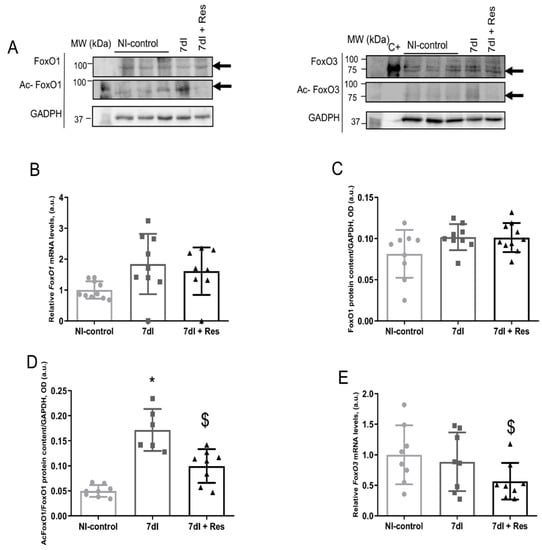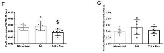 In the limb muscle of 7dI + Resveratrol mice compared with the controls, gene expression and protein levels of FoxO1 did not significantly differ, acetylated FoxO1 decreased, both FoxO3 gene expression and protein content diminished, and no significant differences between the two groups were observed in acetylated FoxO3 levels (Figure 5A–G, respectively).