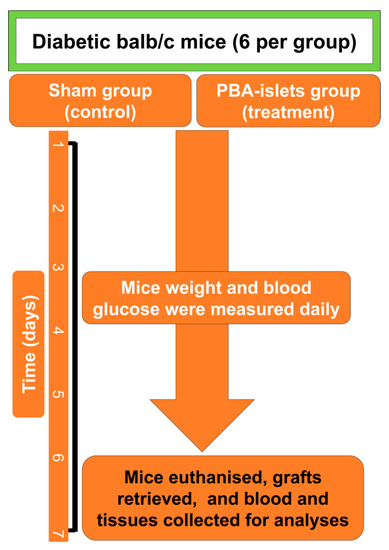 Mice were acclimatized for up to one week after their arrival at the animal holding facility at Curtin University as per normal protocols. The study design and preclinical investigation encompassed two equal groups of mice, induced with diabetes (alloxan; 150 mg/Kg; IP/SC) and once diabetes confirmed (blood glucose >16 mM in two consecutive days, and absence of plasma insulin), both groups transplanted viable islets, harvested from donor healthy syngeneic mice. Diabetes induction and confirmation were carried out using our well-established methods [31,34,58,59,65,66].