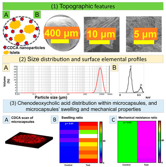 The microencapsulation of islets was performed under sterile conditions as per our established methods in pancreatic cell encapsulation [39,40,41,42,43,44,45,46,47,48]. The effect of CDCA incorporation on islet-containing microcapsules were analyzed in terms of topographic features, spectral elemental composition, microcapsule-size distribution, CDCA distribution on the surface of the microcapsules, and microcapsules’ swelling and mechanical strength profiles. All measurements were carried out based on our well-established methods [40,41,42,43,44,45,46,47,48,49,50,51].